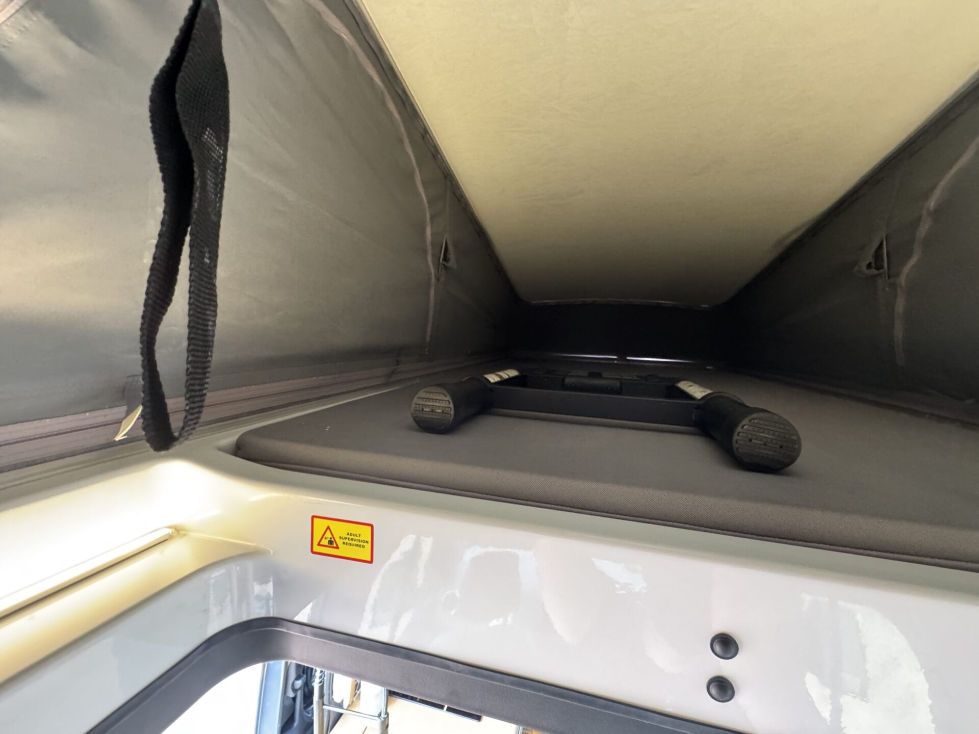 Above, the SCA manual pop-top opens to a view and a breath of air, with integrated LED strip lighting wired independently from the main cabin system. Three 100W Renogy solar panels curve cleanly into the roofline, quietly recharging the power bank as the van sits under open skies.