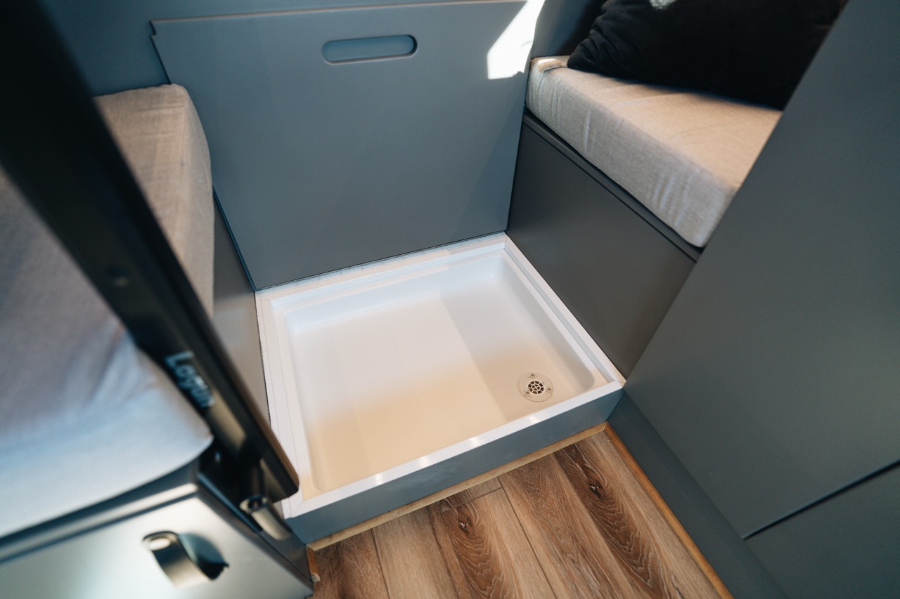 - Indoor pop-up shower with custom curtain solution