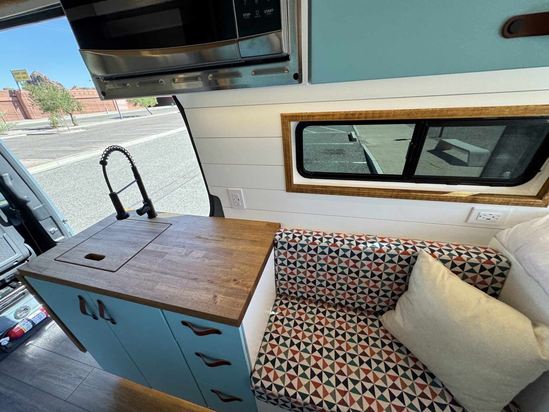 With an 800Ah battery bank, dual DC-DC chargers, upgraded suspension, expanded fuel range, full plumbing, and full climate systems, this setup offers the freedom to explore for days or even weeks at a time. Inside, the layout stays clean and warm with butcher block finishes, wood-stained ceiling, modern lighting, and a functional kitchen and dinette. Outside, it’s equipped with winch power, roof rack, exterior lighting, and carries all the gear you need without sacrificing interior space.